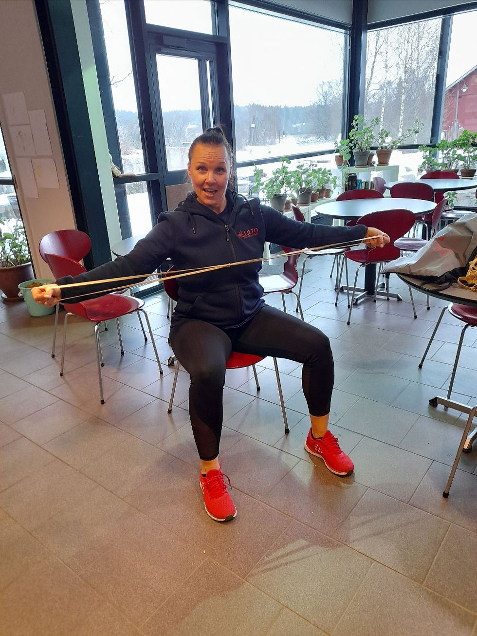 Kuvissa Marin vinkkejä tuolijumppaan - kuminauhan kanssa tai ilman.