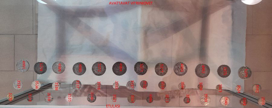 Rahojen laittaminen vitriiniin on tarkkaa puuhaa - yhtään ei saisi tulla häiriötä väliin, ettei mene sekaisin. No, muutama puhelu katkaisi työskentelyn, mutta homma pysyi hanskassa ja nyt ovat antiikin ja kaupunkivaltioiden ajan rahat esillä.